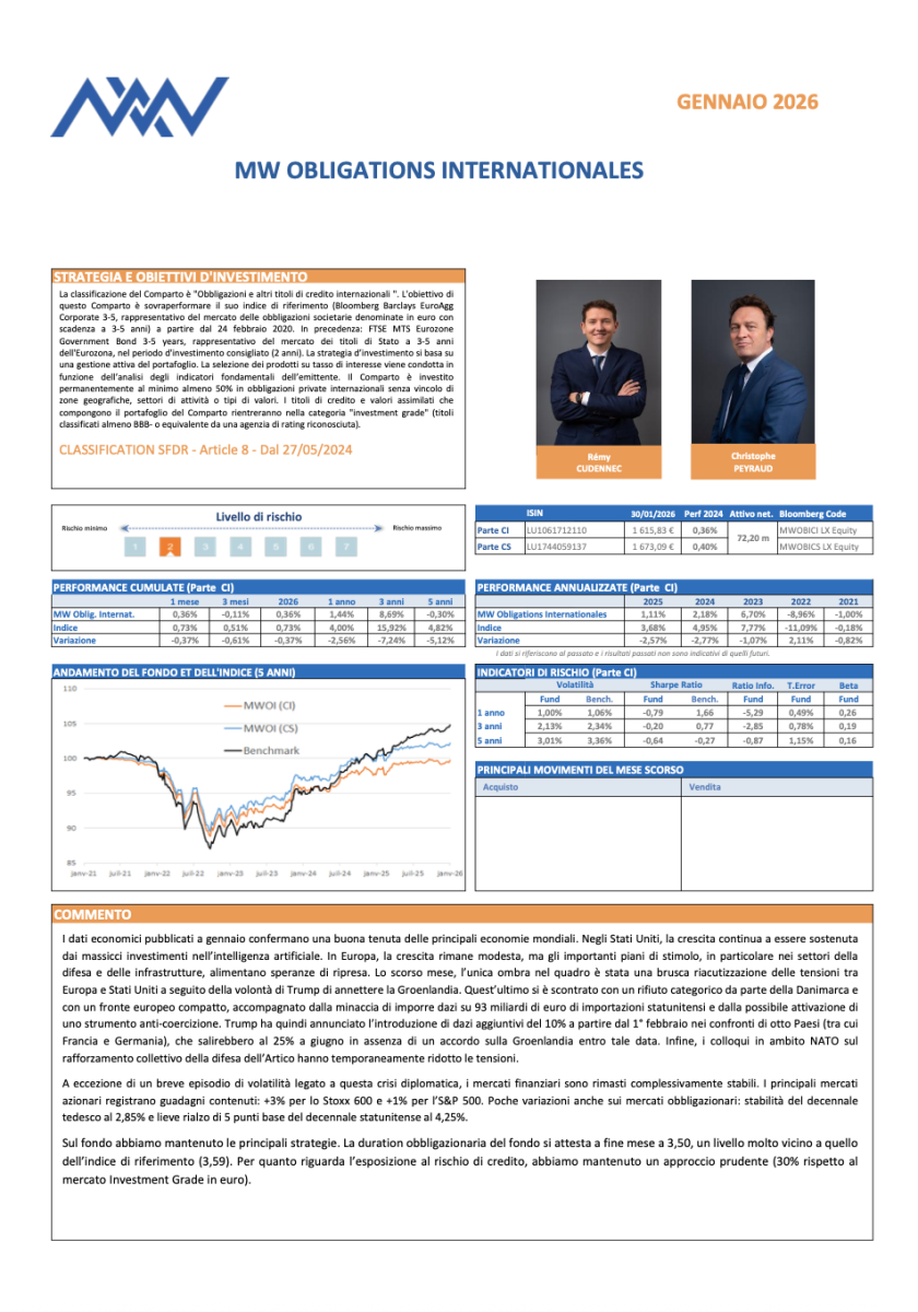 Il fondo MW Obligations Internationales della Sicav Lussemburghese MW ASSET MANAGEMENT è investito in obbligazioni internazionali emesse da emittenti privati quasi esclusivamente in euro, al fine di beneficiare di un rendimento superiore ai titoli di Stato. Il rating medio del portafoglio obbligazionario è per la maggior parte (circa il 70%) in investment grade “BBB”. La differenza può essere investita in obbligazioni speculative (max 10%), con particolare attenzione alla qualità del credito, obbligazioni convertibili (max 20%) ed emittenti non classificati dalle agenzie di rating (max 10%) .