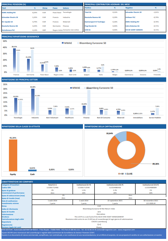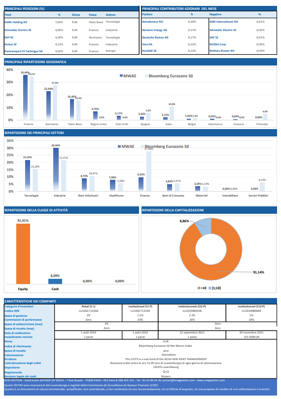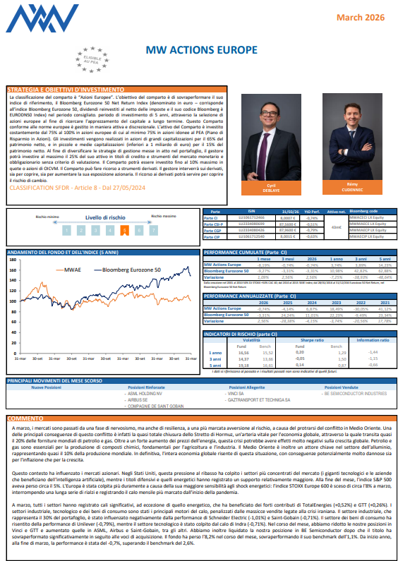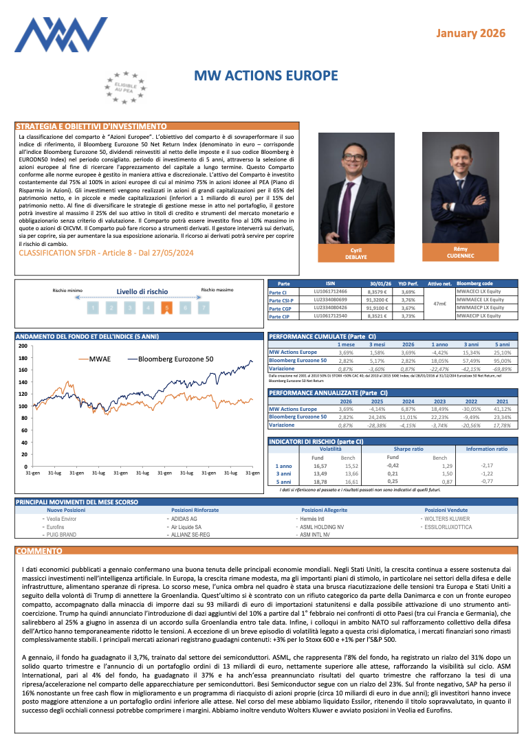 Il comparto MW Actions Europe della SICAV lussemburghese MW ASSET MANAGEMENT è gestito attivamente con riferimento al suo indice e non implica alcun vincolo sulla composizione del portafoglio, che è lasciata alla discrezione del gestore. Il fondo investe almeno il 65% del proprio patrimonio in azioni a grande capitalizzazione (oltre 1 miliardo di euro) o titoli analoghi e può investire fino al 15% del proprio patrimonio in titoli a piccola e media capitalizzazione o analoghi.